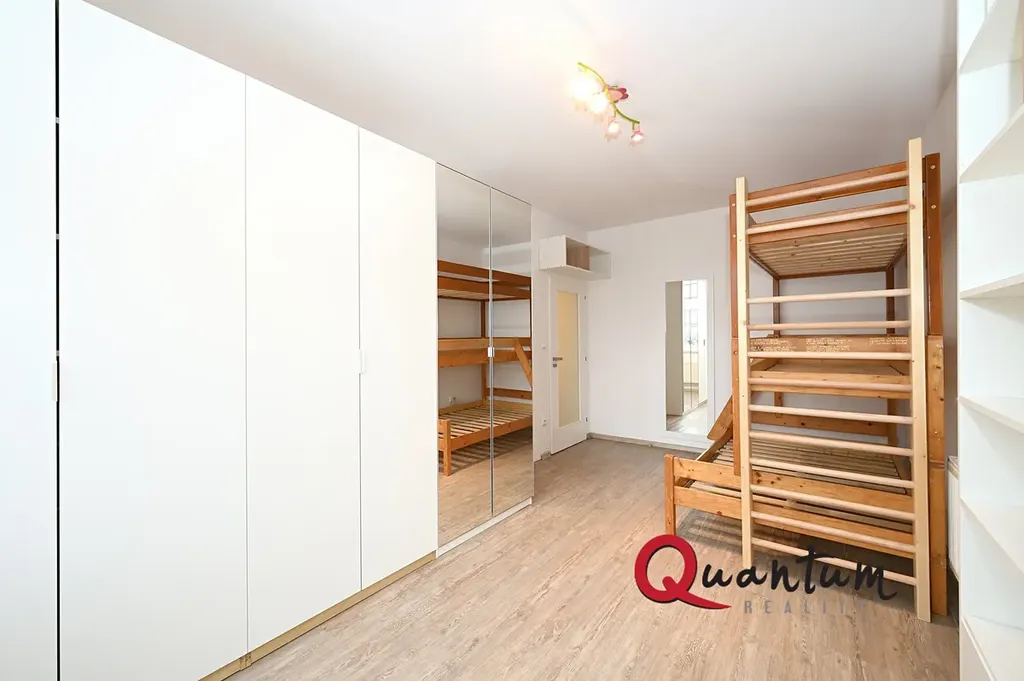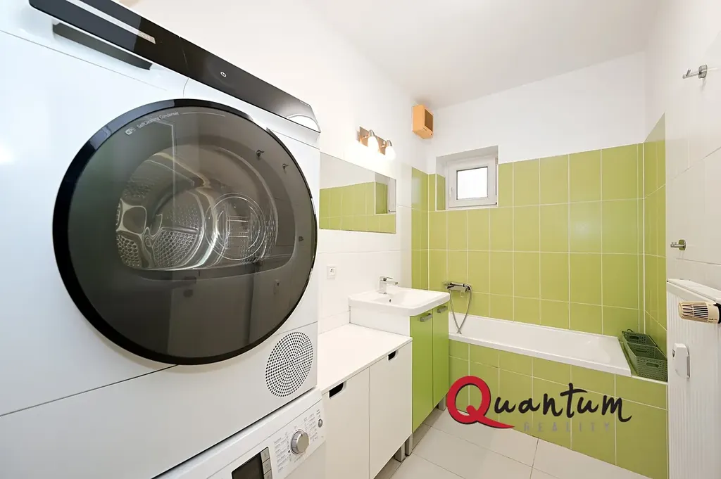 Součástí bytu jsou dvě samostatné ložnice, které poskytují dostatek soukromí. K dispozici je také samostatná toaleta s umyvadlem a koupelna s vanou, vybavená pračkou, sušičkou a úložnými koupelnovými skříňkami.