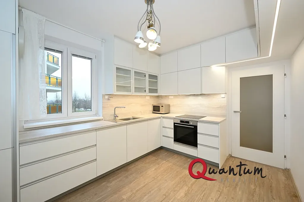 Moderní kuchyně je kompletně vybavena spotřebiči, vestavěnou lednicí s mrazákem, myčkou nádobí, elektrickou troubou, indukční varnou deskou, mikrovlnnou troubou a LED podsvícením po celé délce kuchyňské linky.
