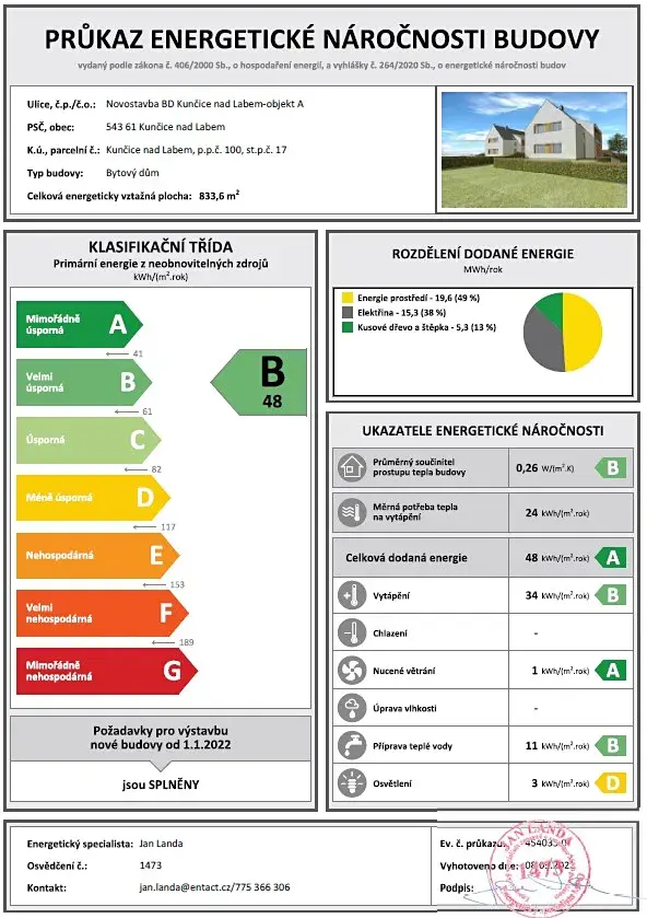 Energetická třída B podtrhuje nízkoenergetický charakter bydlení, což se projevuje ve snížených nákladech na provoz. Ohřev teplé vody a vytápění je řešen tepelným čerpadlem, byt je pak vyhříván teplovodním podlahovým topením.