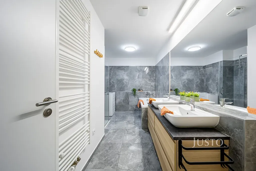 Dispozice je ideální nejen pro rodinné bydlení, ale i jako investice k pronájmu – dva neprůchozí pokoje (13,3 m² a 13 m²) poskytují dostatek soukromí i flexibilitu využití. Koupelna (9,2 m²) je vybavena vanou, sprchovým koutem a prostorem pro pračku i sušičku. Toaleta (2,8 m²) je samostatná.