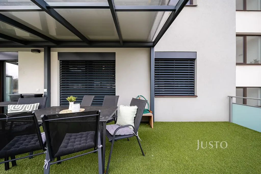 A teď to hlavní – terasa. Opravdu velkorysá, částečně zastřešená, s možností stínění pomocí venkovních žaluzií. Nabízí prostor pro posezení, relaxaci, nebo drobné zahradničení. Díky svému rozměru si zde můžete vytvořit zelenou oázu klidu nebo stylový lounge.