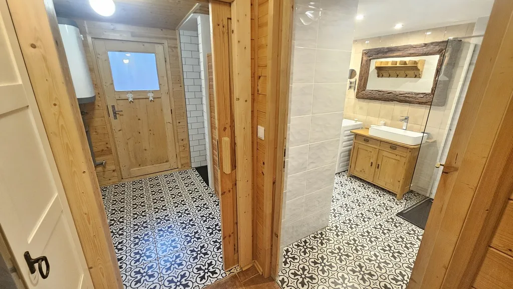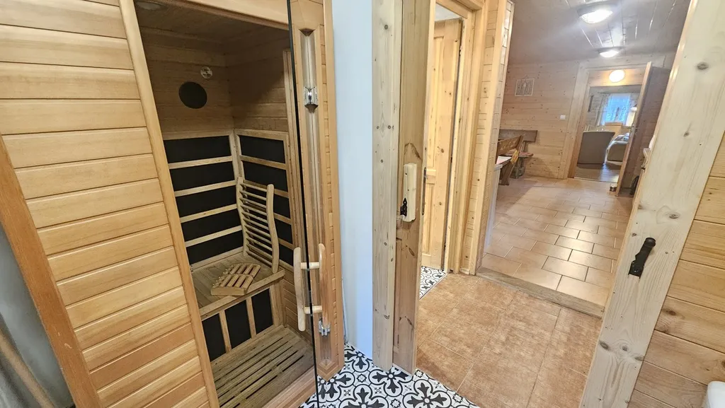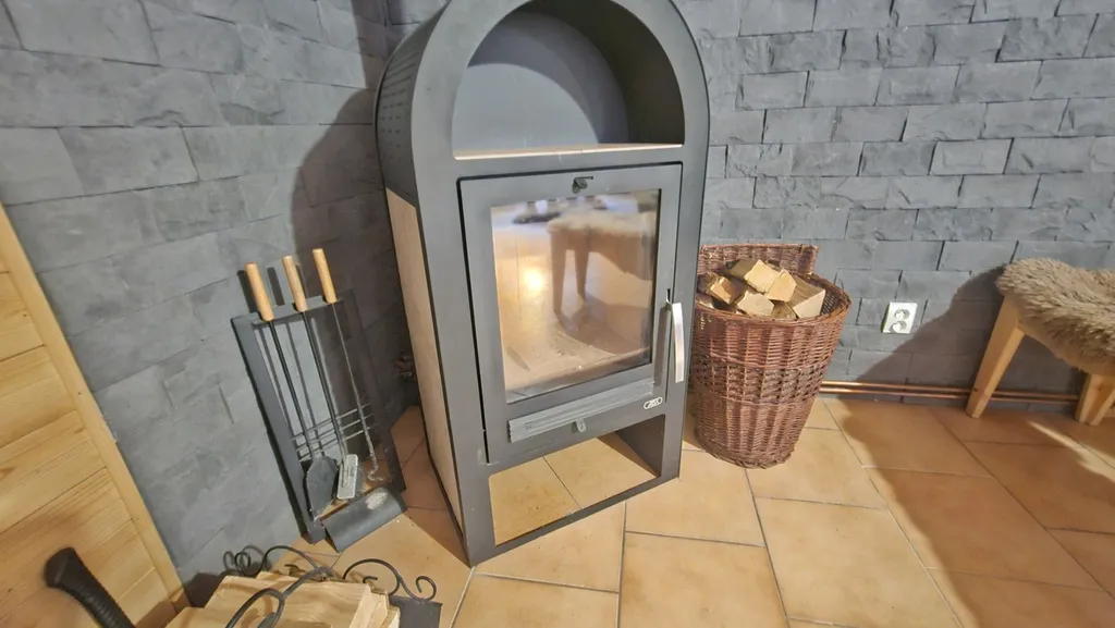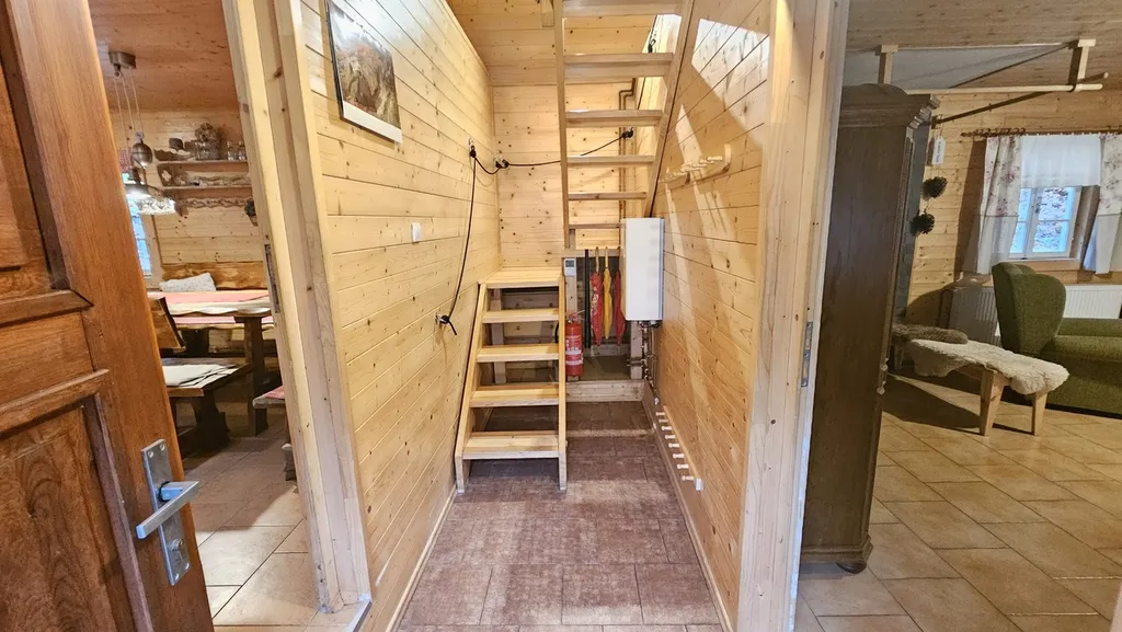 Dispozice: Přízemí - útulný obývací pokoj s krbovými kamny – místo pro společné večery, různé hry nebo šipky, vstupní hala se schodištěm do patra, pod kterým je umístěn elektrokotel . Plně vybavená kuchyně s jídelním stolem, vestavěnými spotřebiči, myčkou nádobí a vinotékou. Za kuchyní je koupelna, sauna, dvě samostatné toalety a bojler na ohřev vody.