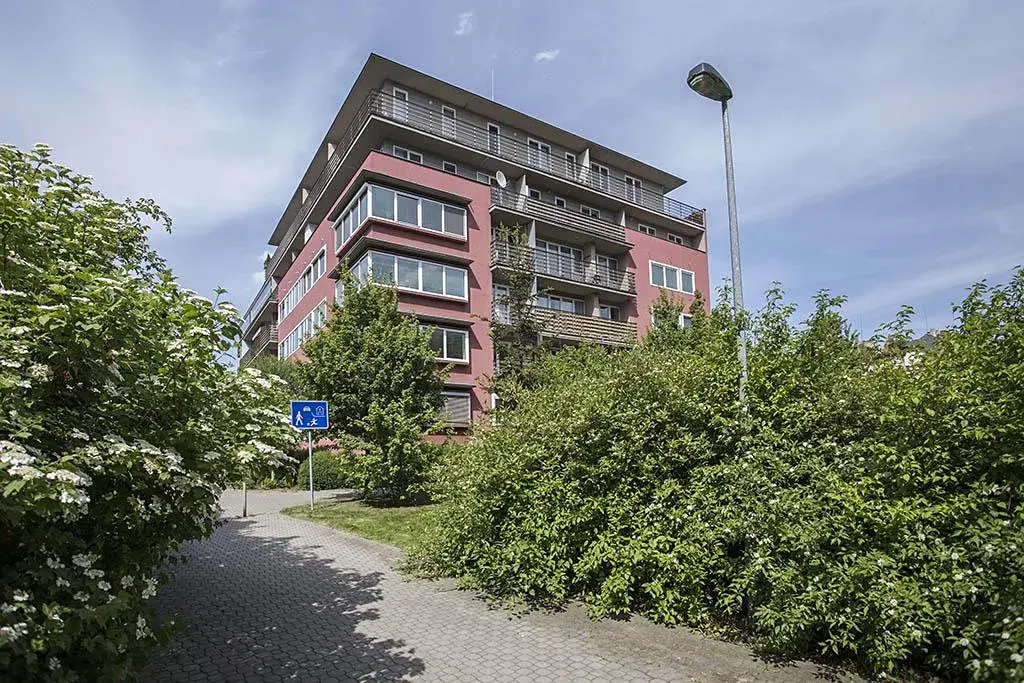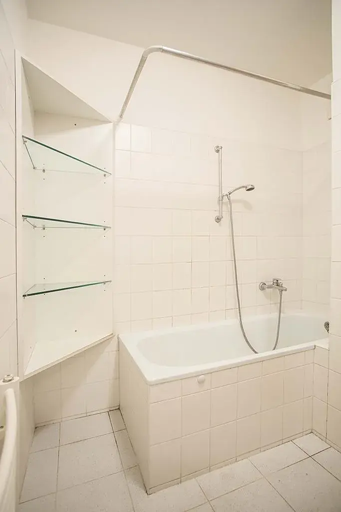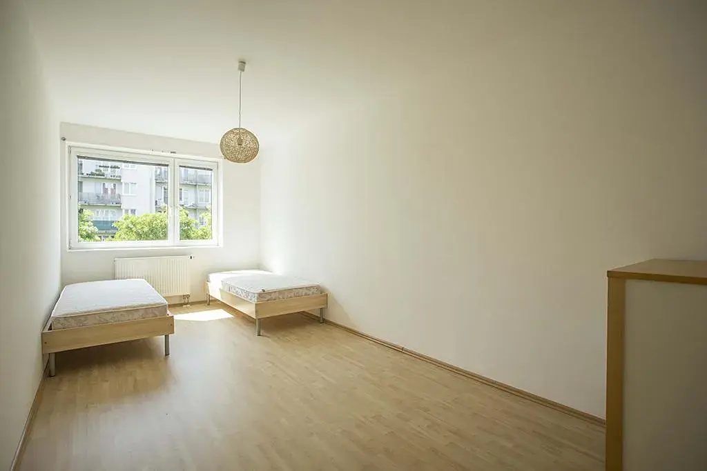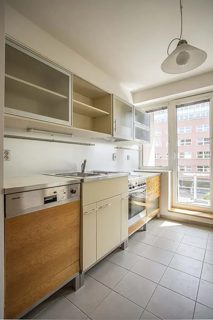 Světlý byt s převážně jižní a západní orientací má velký obývací pokoj, kuchyň vybavenou spotřebiči, vestavné skříně na chodbě, dvě ložnice, koupelnu s vanou a pračkou a extra toaletu.