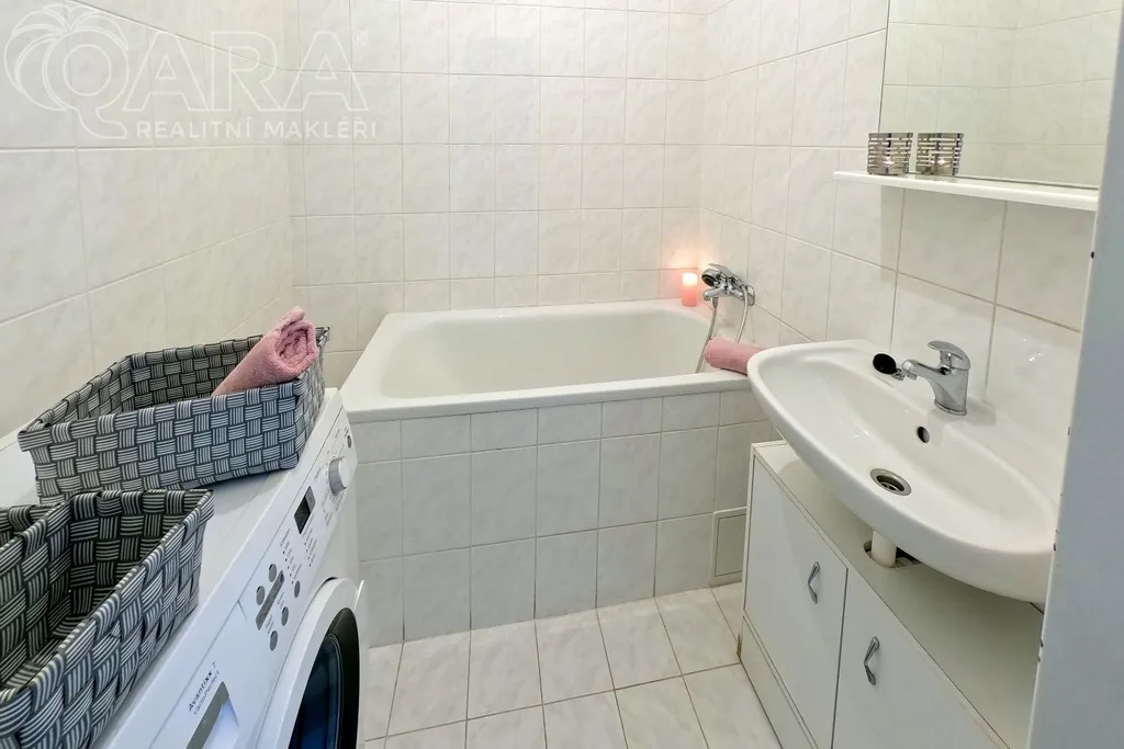 Zařízený byt o velikosti 37 m2 se nachází ve druhém podlaží bytového domu. Obývací pokoj a kuchyně jsou orientovány na jih. Kuchyňská linka je vybavena vestavěnou lednicí, indukční deskou na vaření a mikrovlnnou troubou. V pokoji je velká skříň, dvoulůžko, sedací souprava, jídelní a pracovní stůl. K dispozici je také vstupní chodba, koupelna s vanou a pračkou, a samostatné WC.