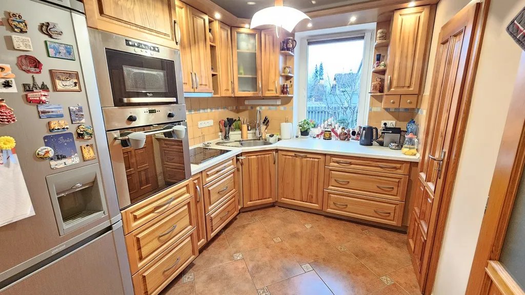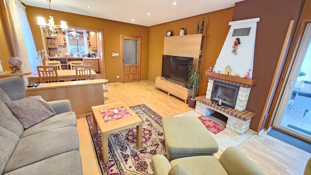 Srdcem domu je prostorný obývací pokoj s krbem a přímým vstupem na terasu, na který plynule navazuje plně vybavená kuchyně. V každém podlaží je k dispozici koupelna s toaletou. Vytápění i ohřev vody zajišťuje plynový kotel.