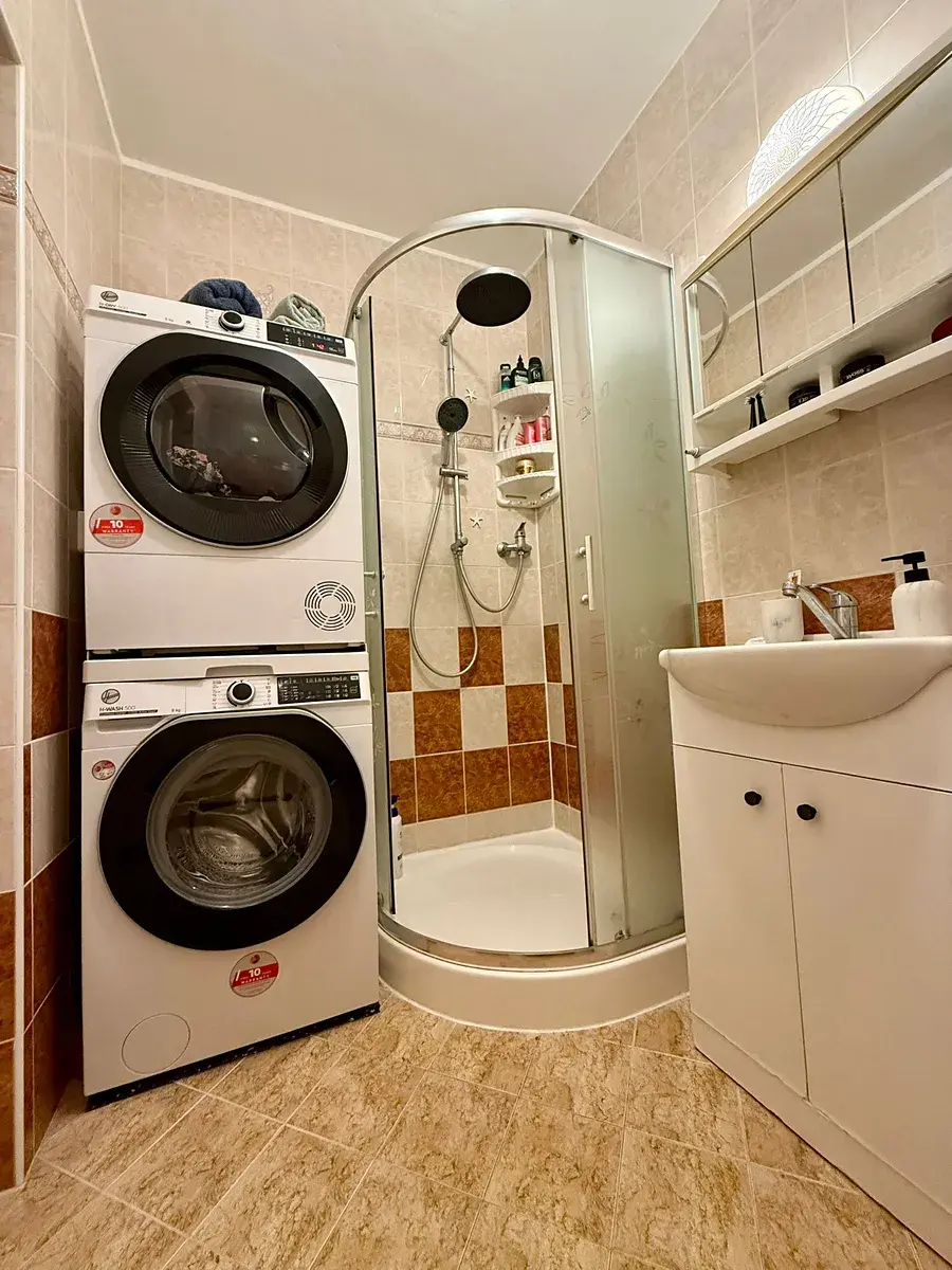 Koupelna se sprchovým koutem a WC, pračka a sušička prádla.