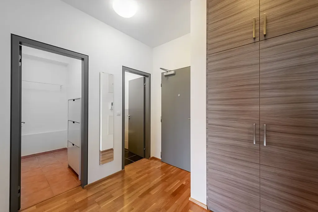 vestavná skříň nacházející se v chodbě. Na podlahách jsou dubové