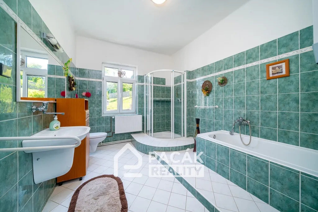V přední části pozemku u veřejné komunikace se na rovinatém pozemku nachází hlavní stavba rodinného domu se zastavěnou plochou 254m2. Objekt je celý podsklepený, má 2 obytná podlaží se světlou výškou 330cm a půdou s potenciálem. Současná dispozice domu nabízí na každém patře samostatný velkometrážní byt s výměrou cca 190m2. Historie spadá do roku 1933, kdy na přelomu tisíciletí byl rodinný dům adaptován do současné podoby. Byla vyměněna krytina na střeše, nové rozvody, omítky, podlahy, okna i fasáda. Stavba působí velice důstojným dojmem. Nabízí prostorné neprůchozí místnosti a široké chodby. Přístup k objektu i pro nákladní automobily.