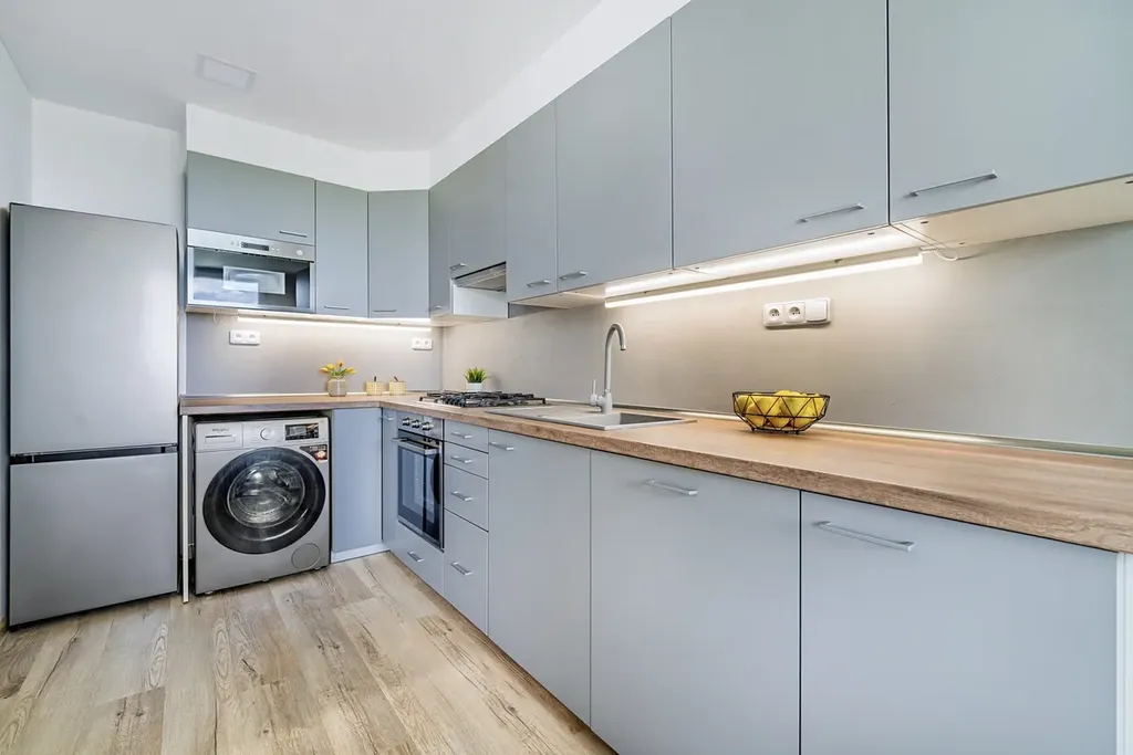 V kuchyni je instalována nová kuchyňská linka včetně spotřebičů – myčka, lednice, pračka, plynový sporák (s přípravou na elektrický).