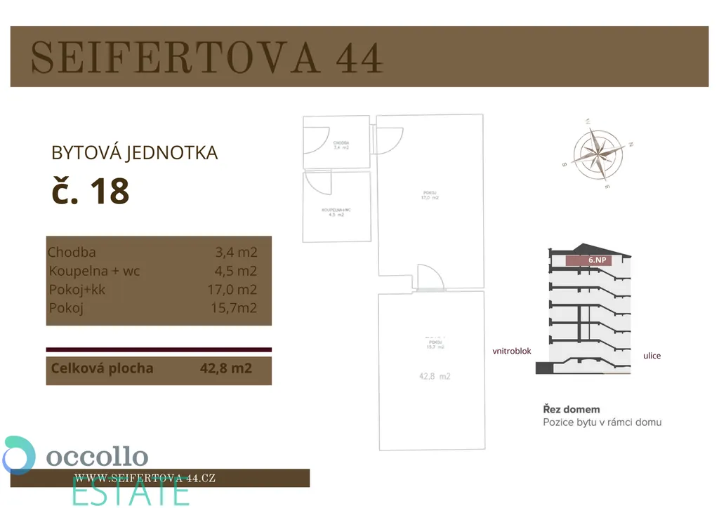 Seifertova ulice nabízí výborné spojení s centrem města a kompletní občanskou vybavenost v docházkové vzdálenosti. V okolí se nachází množství kaváren, restaurací i kulturních míst. Nedaleko leží Riegrovy sady, ideální místo pro volný čas a relaxaci.