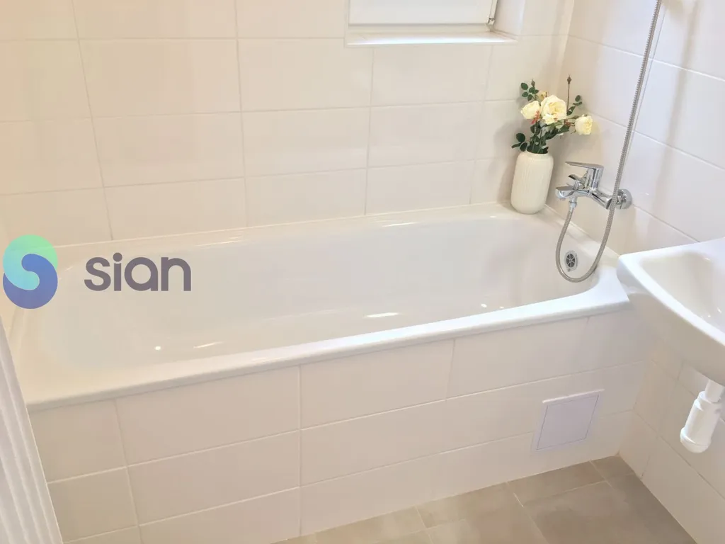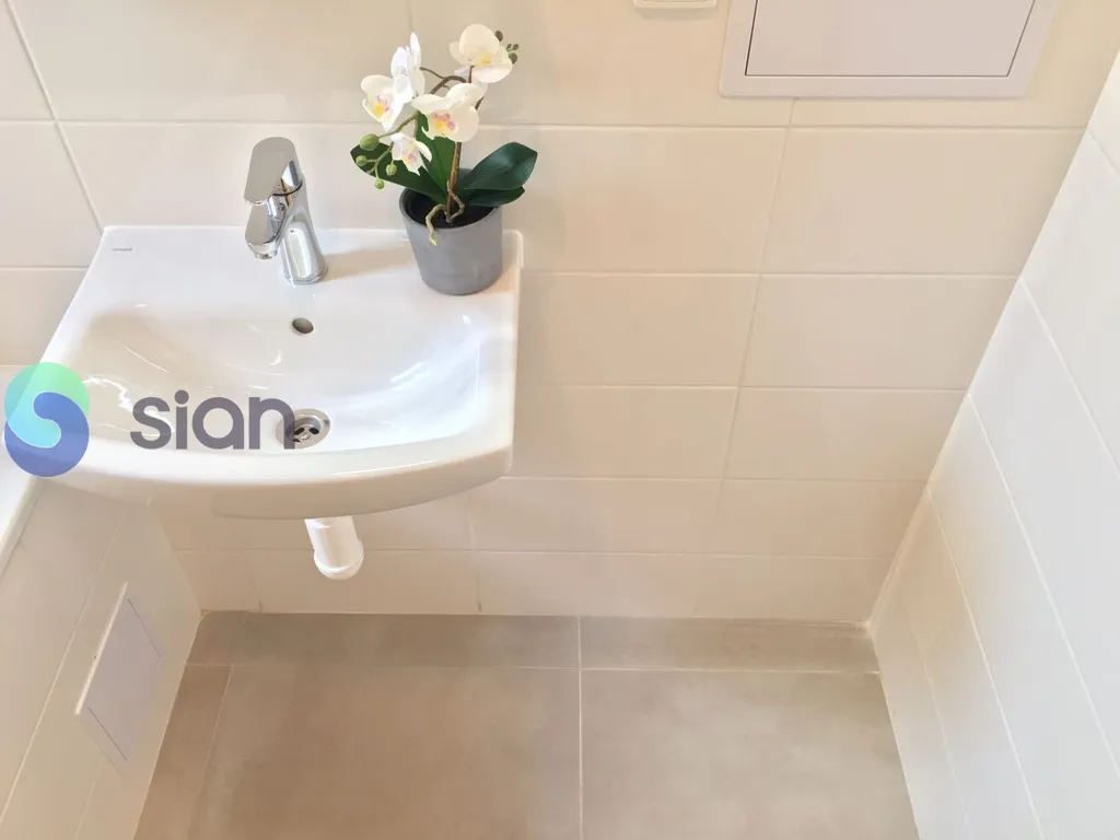 Koupelna s vanou a umyvadlem a možností připojení pračky, toaleta je odděleně. Kuchyňská linka je vyrobena na míru a je opatřena elektrickým sporákem a elektrickou troubou.