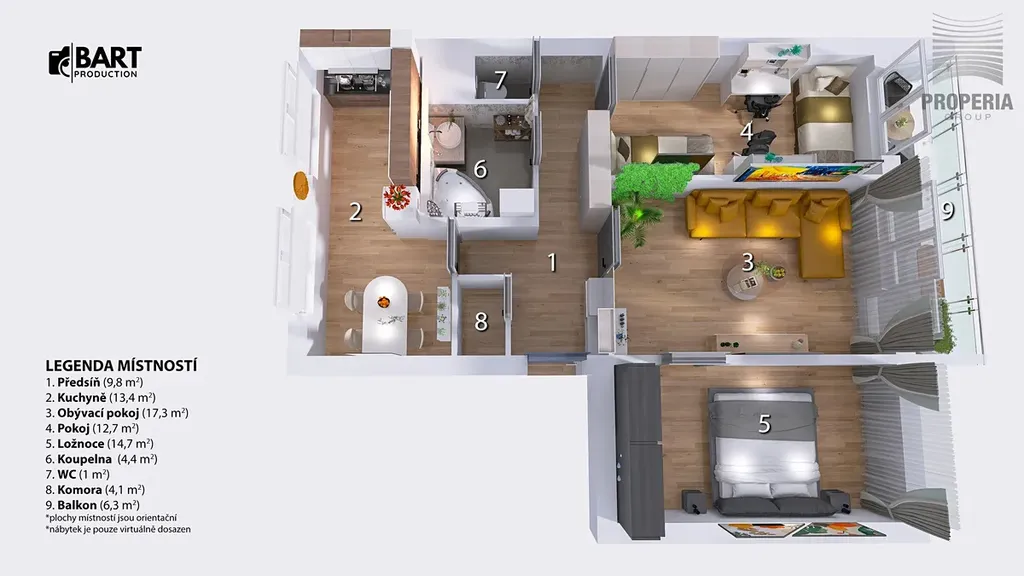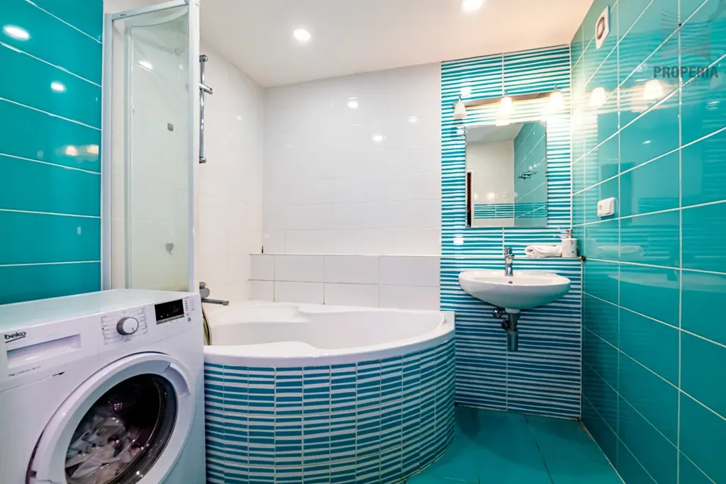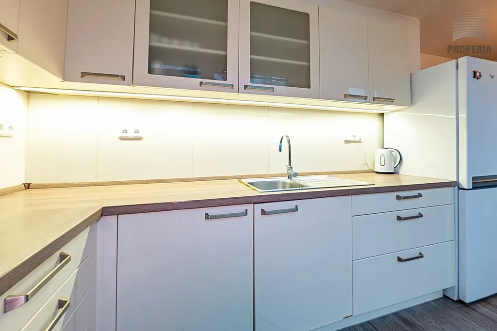 Byt je vybaven elegantní kuchyňskou linkou s vestavnými spotřebiči a samostatně stojící chladničkou s mrazákem. Bytové jádro je zděné – koupelna s rohovou vanou a místem pro pračku, WC samostatné. Úložné prostory v předsíni jsou řešeny praktickou šatnou a velkou vestavnou skříní. Prostorná lodžie (6,3 m²) pak poskytne dostatek místa pro relaxaci po pracovním dni či pro obyčejné sušení prádla.