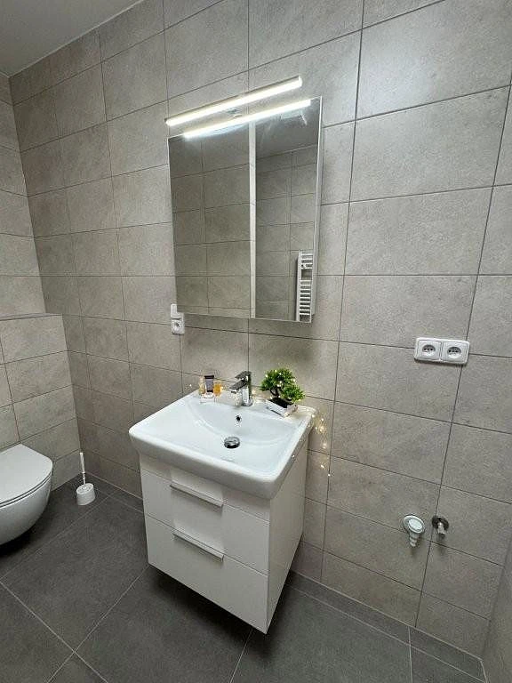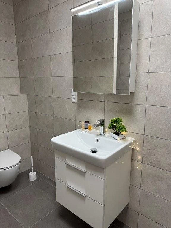 Byt je částečně vybaven, a to kuchyňskou linkou včetně spotřebičů, umyvadlovou skříňkou v koupelně a všechny místnosti jsou vybaveny svítidly.