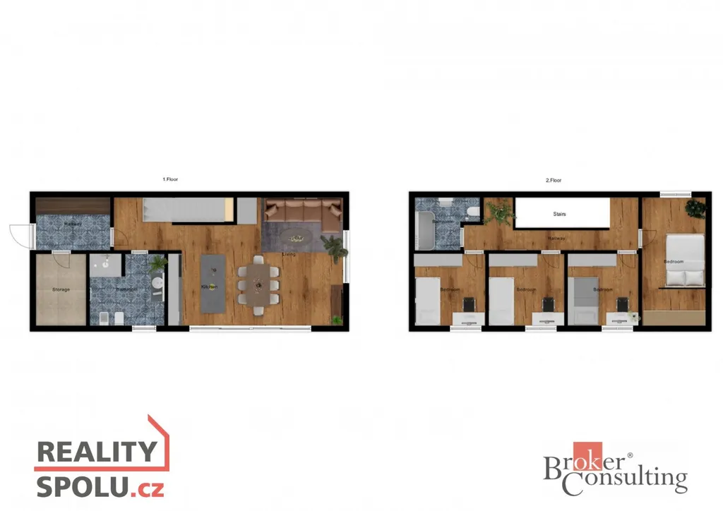 Dominantou přízemí je otevřený obytný prostor s obývacím pokojem, jídelnou a kuchyní, který je přímým vstupem propojen s terasou a zahradou. Dále se zde nachází předsíň, technická místnost a koupelna se sprchovým koutem a toaletou. V horním patře je situována hlavní ložnice se šatnou, tři další samostatné pokoje a druhá koupelna s vanou a WC.
