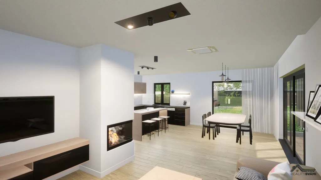 Interiér je navržen s důrazem na funkčnost a komfort moderního bydlení. Prostorný obývací pokoj s kuchyňským koutem plynule navazuje na soukromou zahradu, která nabízí klid a dostatek soukromí.