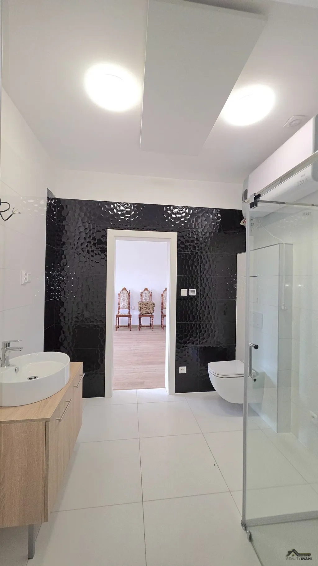 Koupelny a WC: dlažba 60×60 cm, obklad 90×30 cm (bílá + černý profil).