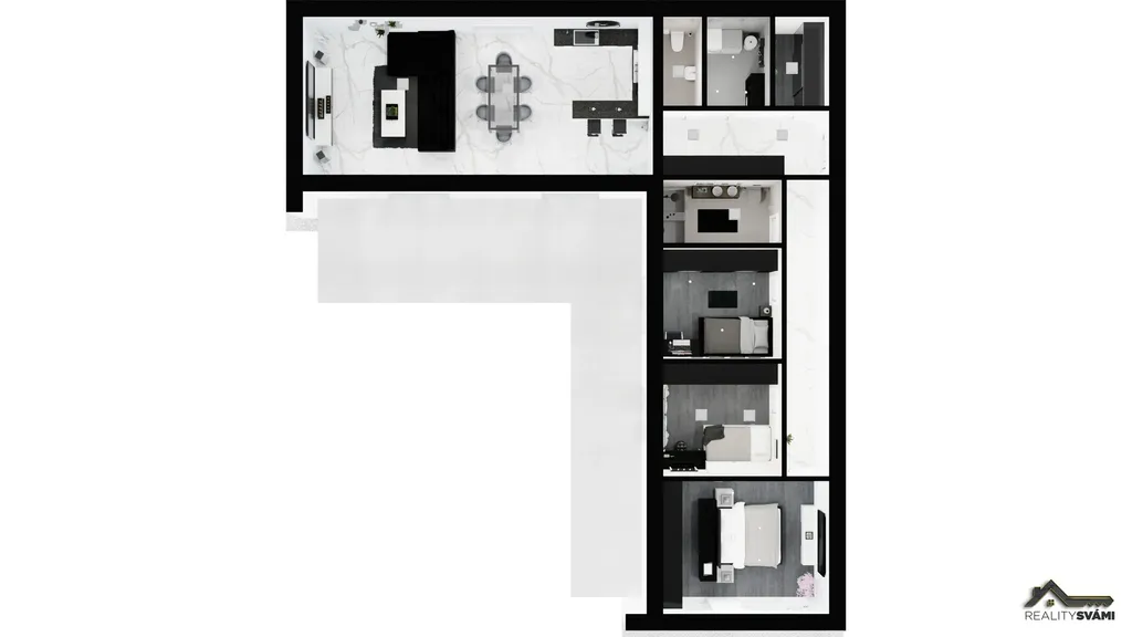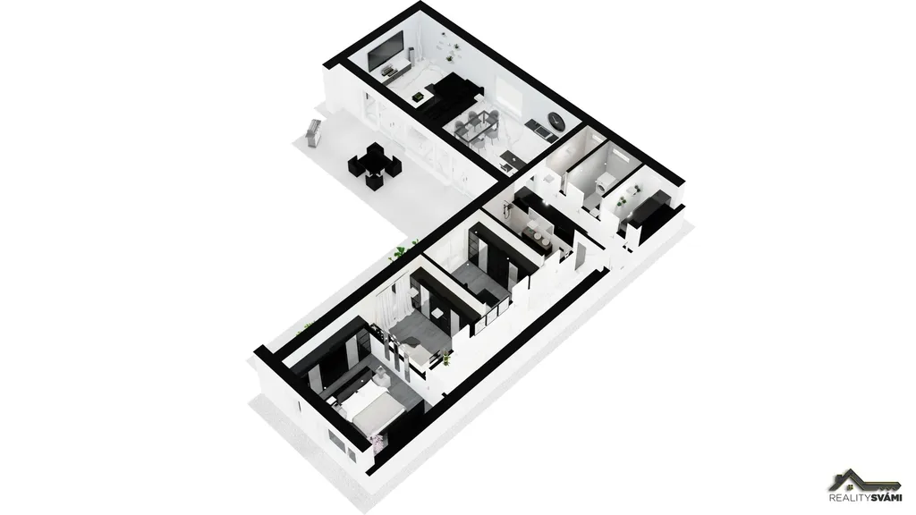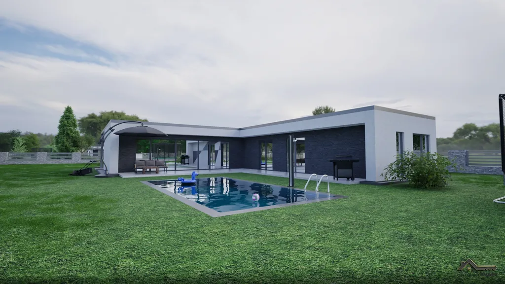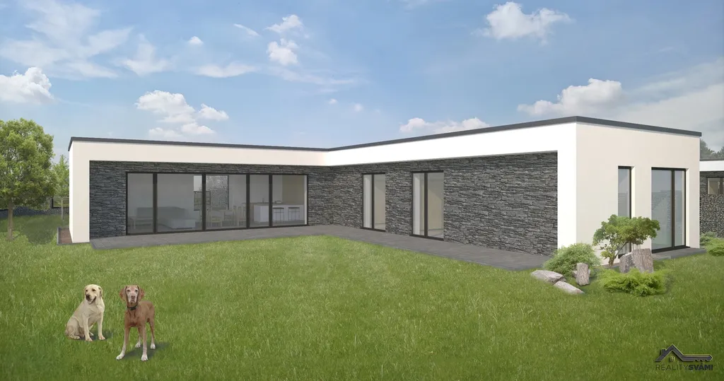 Samotný dům je zděný, s dispozicí 4+kk, technickou místností, šatnou, koupelnou s WC a samostatným WC, spojeným obývacím pokojem s kuchyní, kde je umístěný vstup na terasu. Ten je také možný z obou menších pokojů.