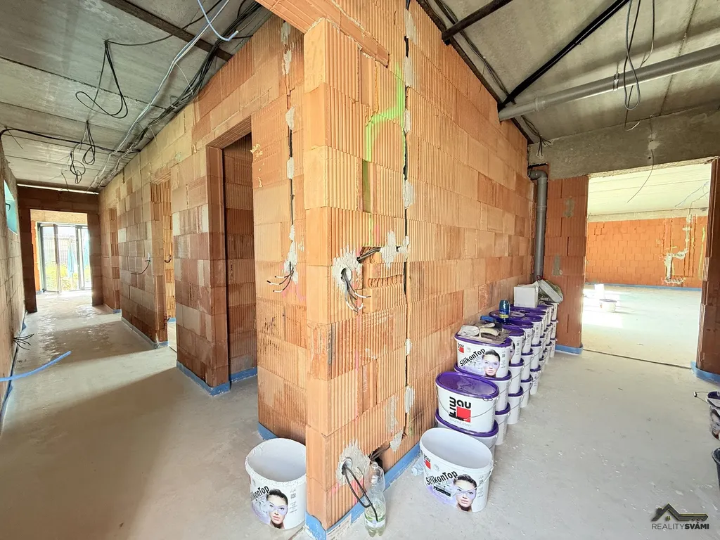 Dům ve fázi výstavby, kdy je hotová střecha, fasáda, příprava pro venkovní žaluzie a mnoho dalšího, ale i tak se zde nabízí možnost ovlivnit použité materiály, či změnit barevnost použitých materiálů, nebo rozložení kuchyňské linky. Nelze zasahovat do rozložení domu. V domě je dále použito vodní podlahové topení s tepelným čerpadlem, klimatizace v každém pokoji. Stavba je napojena na elektřinu, vodu a kanalizace bude řešena pomocí ČOV. Obec má v plánu rozšíření kanalizace, což bude možné do budoucna použít pro napojení domu.