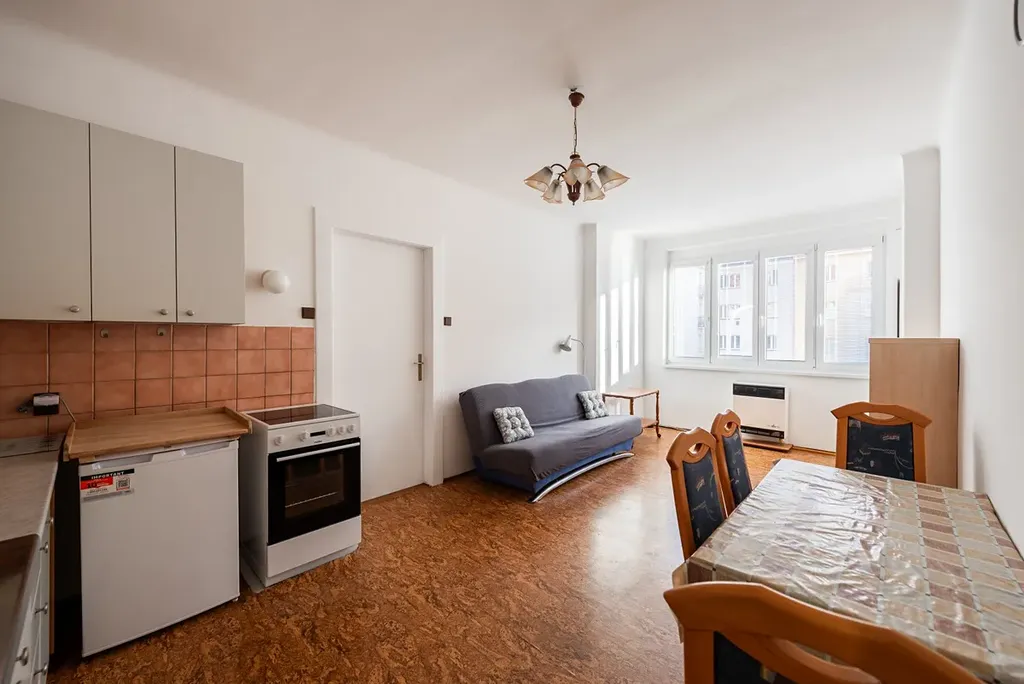 Jedná se o byt spíše pro nenáročné, ovšem na skvělém místě, v dobré velikosti a s dispozicí i vybavením připraveným k praktickému a pohodlnému každodennímu životu. Byt působí velmi příjemně, má funkční uspořádání a je orientován na východ. Obývací pokoj je propojený s plně dostačující kuchyňskou linkou vybavenou elektrickým sporákem, menší lednicí a mikrovlnnou troubou. Ložnice je samostatná a nabízí dostatek prostoru pro plnohodnotné vybavení. Koupelna je vybavena vanou a místo se našlo i na pračku, která je součástí pronájmu. Toaleta je řešena zvlášť. Na chodbě se nachází velká vestavná skříň poskytující značný úložný prostor. Radost Vám budou dělat dřevěné nadčasové parkety a plastová okna se žaluziemi. Vytápění je lokální plynové (WAW) a ohřev vody zajišťuje elektrický bojler. Součástí pronájmu je také velmi prostorný sklep.