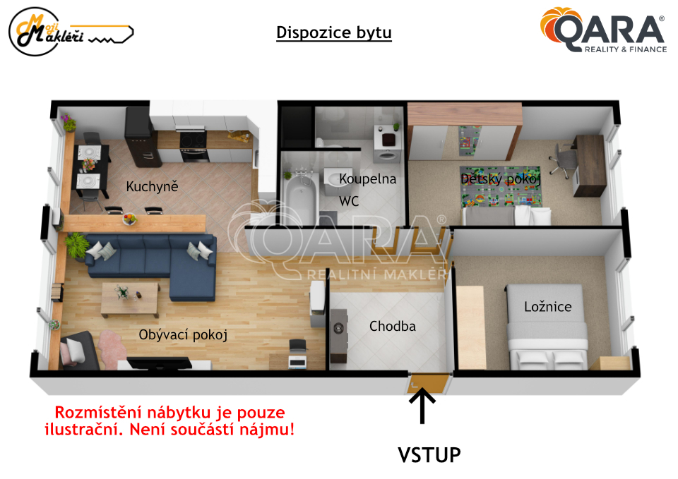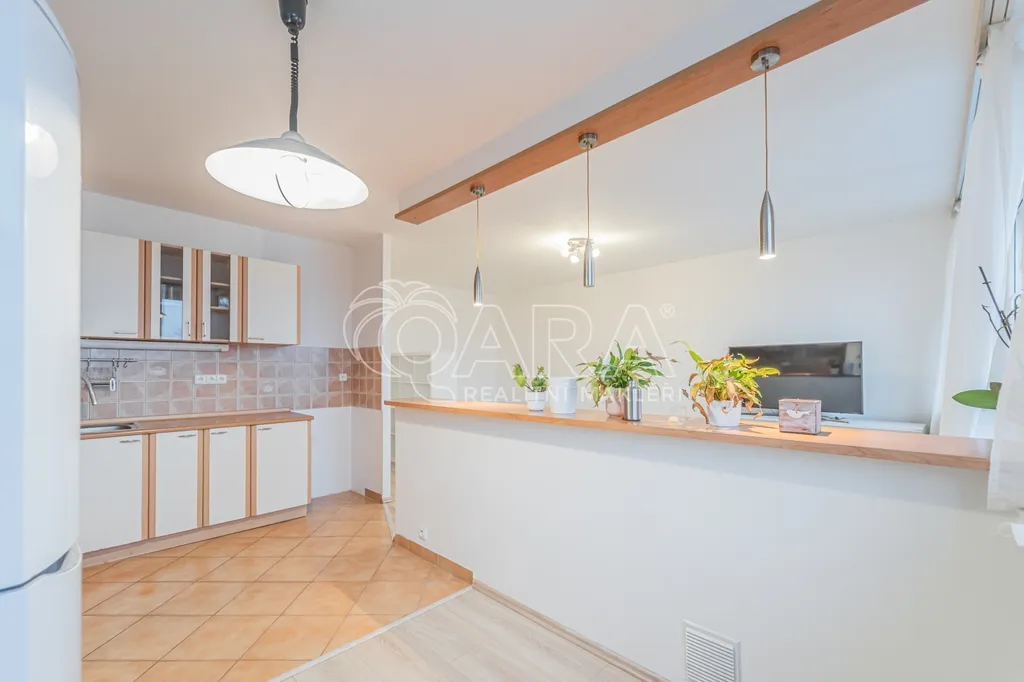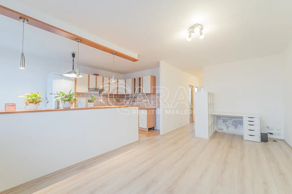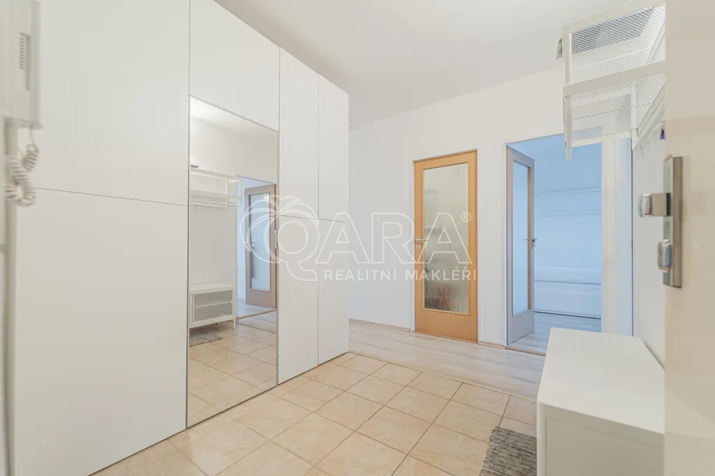 Vstupní předsíň je prostorná a vede do všech neprůchozích pokojů. Obývací pokoj je propojený s kuchyňským a jídelním koutem, který je vybaven spotřebiči (myčka není aktuálně k dispozici, lze dodat po dohodě s majitelem). Dále jsou k dispozici ložnice a dětský pokoj nebo pracovna. Koupelna je vybavena vanou a prostorem pro pračku i sušičku, toaleta je částečně stavebně oddělená. Obývací pokoj s kuchyní je orientován na jihovýchod, ložnice a dětský pokoj na severozápad, což zajišťuje dostatek světla a příjemnou atmosféru. Byt se pronajímá částečně vybavený dle fotografií.