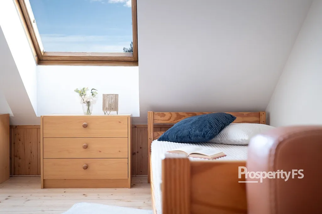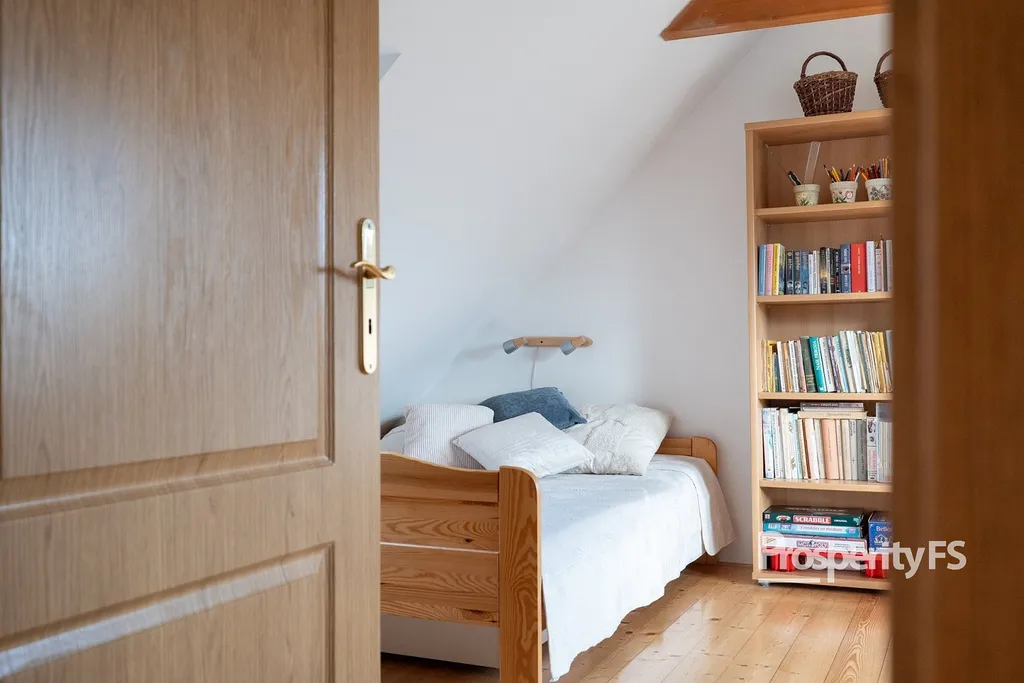 • Byt v 2. NP je zařízen taktéž jako plně samostatná bytová jednotka, tentokrát ve stylu z přelomu roku 2000 s důrazem na použití dřeva