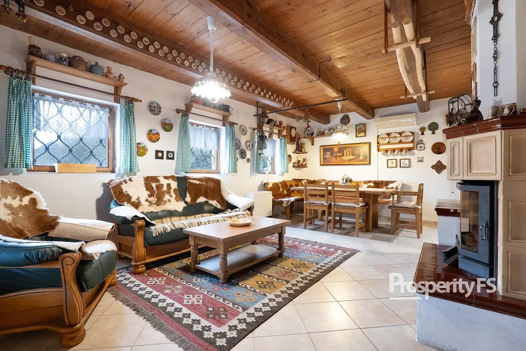 • O teplo domu se starají krásná akumulační kamna, která rozvádí teplý vzduch po celém domě. Dále je k dispozici 2x tepelné čerpadlo vzduch-vzduch a 3x přímotop