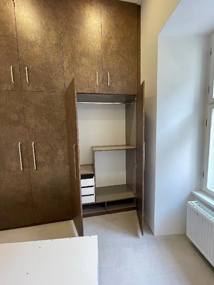 Ložnice je vybavena vestavěným základem pro umístění matrací s úložným prostorem (je nutné dodat si vlastní matrace), luxusními vestavěnými skříněmi, kobercem.