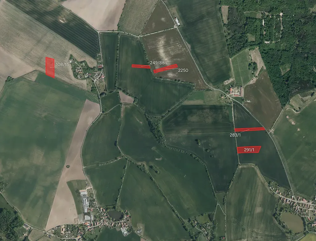 Celková výměra všech pozemků je 32 815 m², k prodeji je na nich 10 938 m².