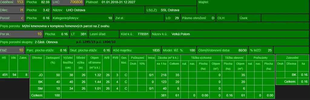- p.č. 1304/10 vedená jako lesní pozemek o celkové výměře 265 m2 (stáří lesa 101 let - zastoupení dřevin jedle, buk, smrk )