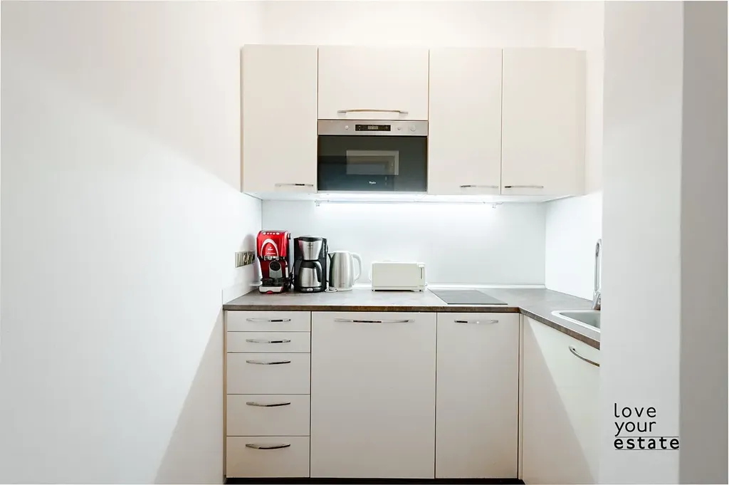 Byt sestává z předsíně s vestavěnou skříni, koupelnou se sprchovým koutem a pračkou, samostatný kuchyňský kout (varná deska, mikrovlnka, menší lednice), obývací pokoj plně vybaven nábytkem, jak vidíte na fotkách. Vysoké stropy, byt je tak velmi světlý.