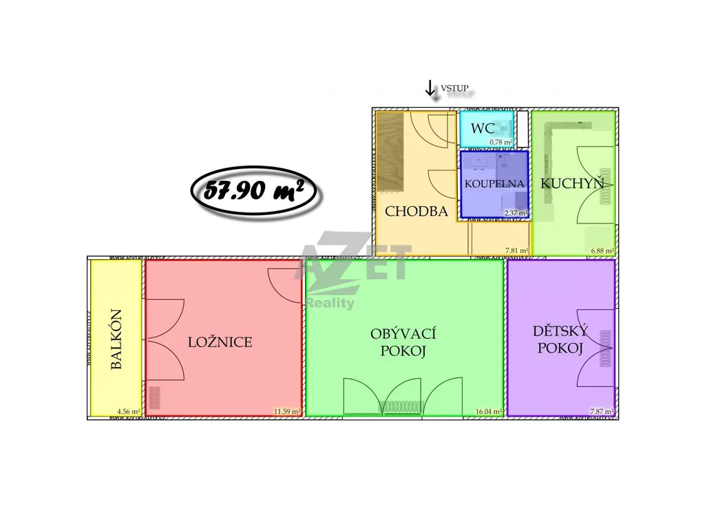 - WC - 0,78 m2 o rozměrech 0,84 x 0,92 m