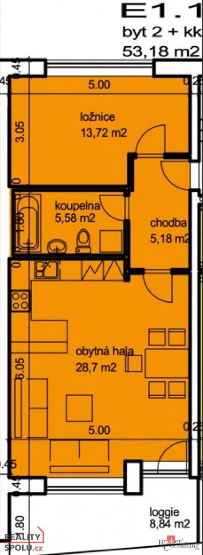 Byt o celkové velikosti 62 m2 (53,2 m2 je plocha bytu + cca 9 m2 lodžie) má dispozici 2+KK a je umístěn v 2. patře domu.