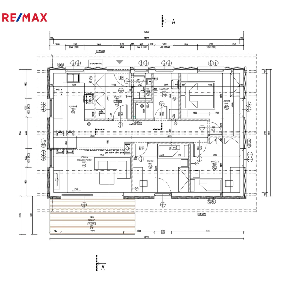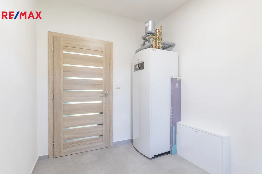Dům je dispozičně velmi dobře navržen pro menší rodinu. U vstupu je zádveří, kde se nachází jednotka tepelného čerpadla, kterou lze prakticky a esteticky zakomponovat do předsíňové stěny. Dále je zde WC. Následuje prostorný obývací pokoj s kuchyní, přes který se dostanete na jižně orientovanou terasu, kde je možné nechat vyrobit pergolu na míru. V ceně je zahrnuta kuchyňská linka českého výrobce včetně elektrospotřebičů značky Philco – indukční deska, digestoř, kombinovaná lednice s mrazákem, dřez s baterií, myčka, mikrovlnná trouba.