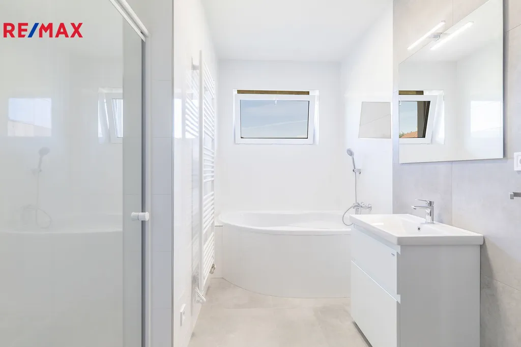 V klidové části domu nalezneme tři pokoje, koupelnu s vanou, sprchovým koutem.