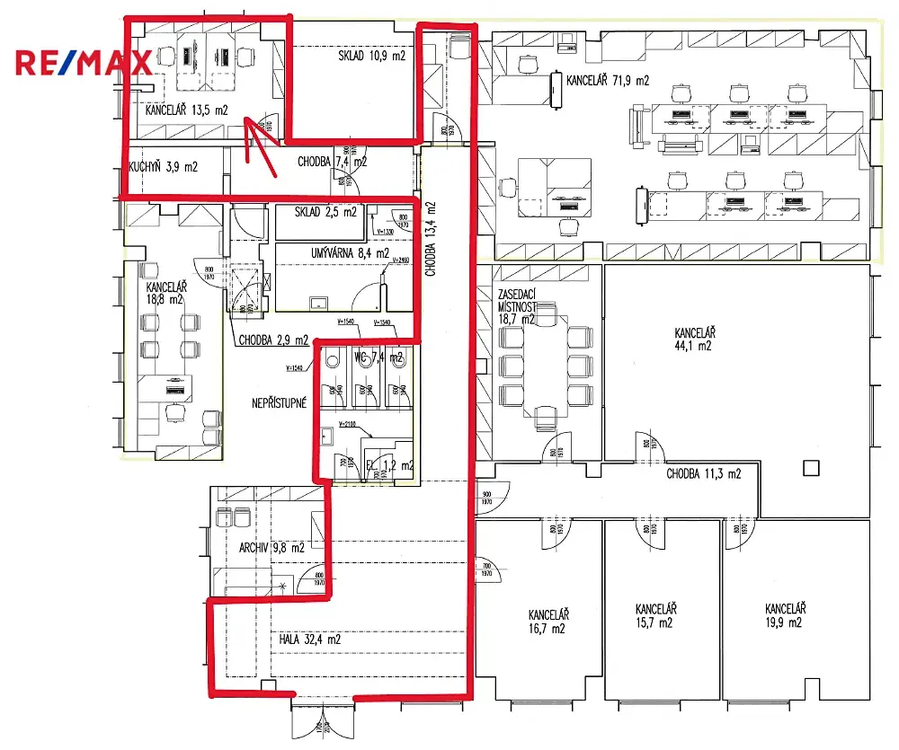 Kancelář není vybavena nábytkem. Společná kuchyňka s WC. K dispozici je možnost pronajmout si více kanceláří najednou, které se nacházejí na stejném patře.
