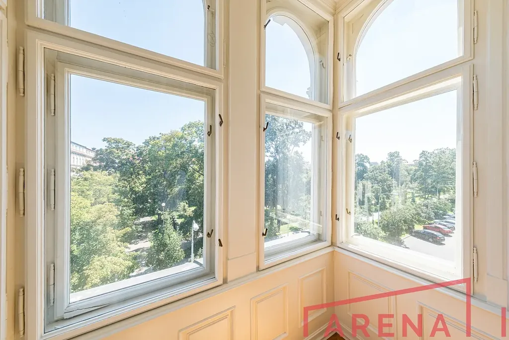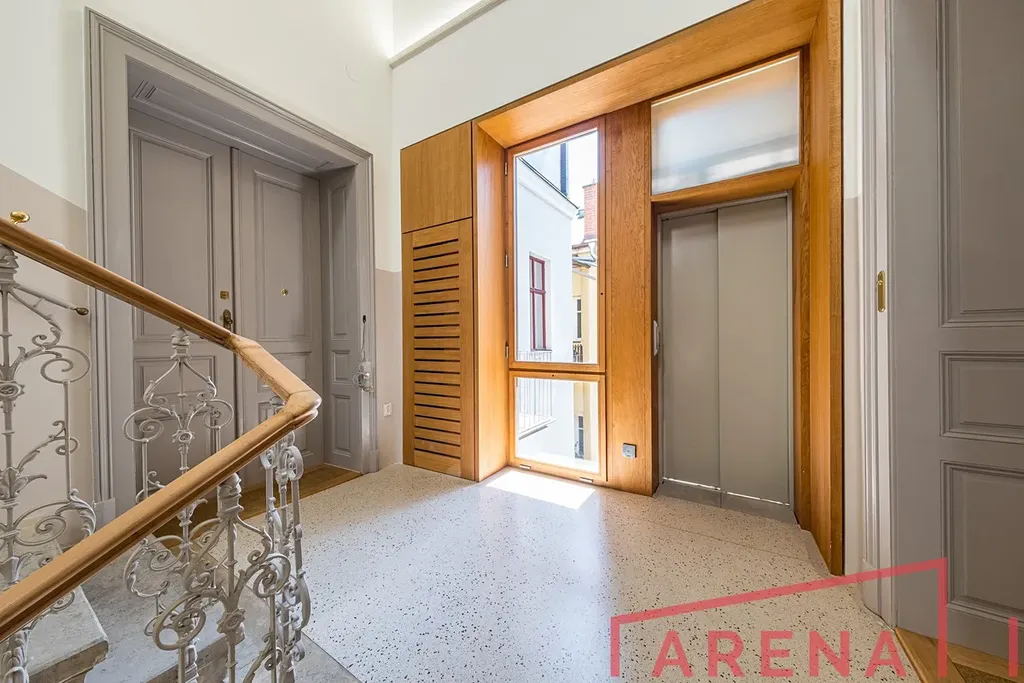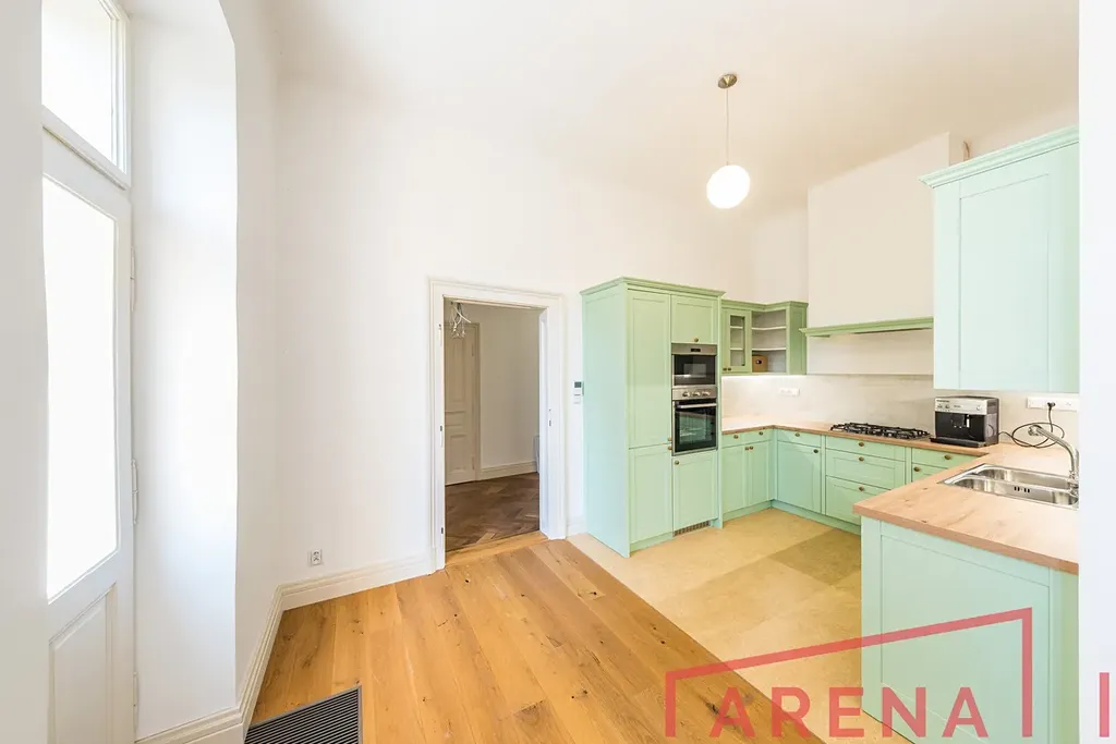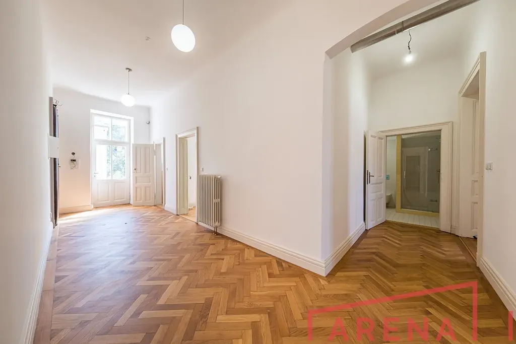 Byt zaujme elegantním interiérem s původními architektonickými detaily, vysokými stropy a kvalitními materiály.