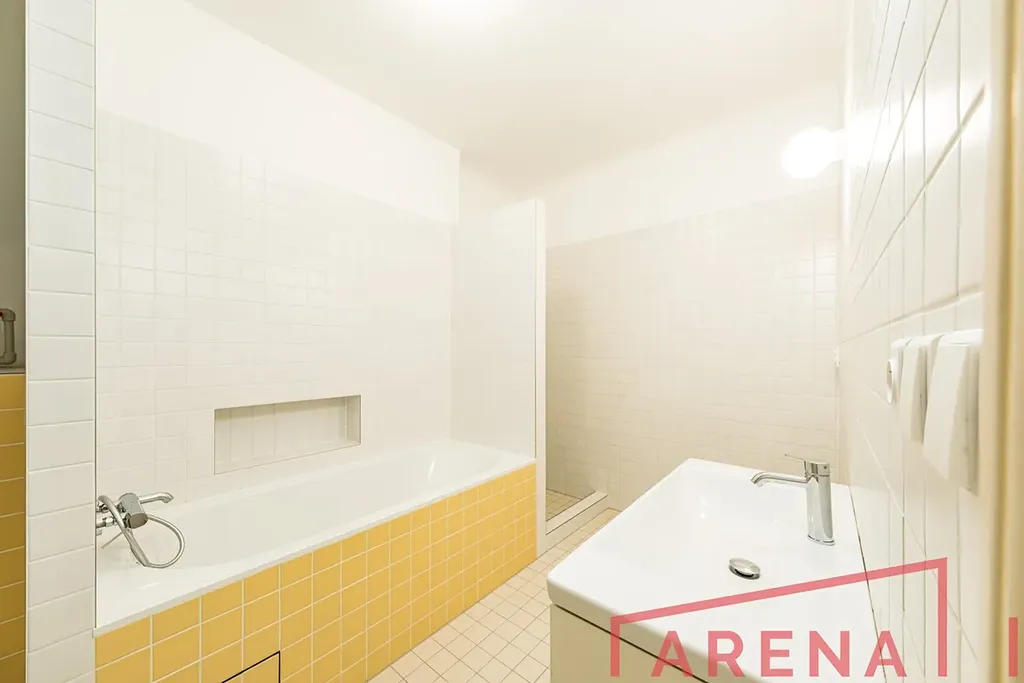 - moderní koupelna s vanou, sprchovým koutem a přípravou pro pračku