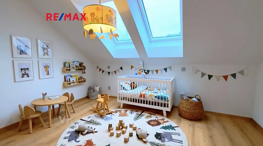 V horním patře se nachází velkoryse řešená ložnice s pracovnou, jejímž největším benefitem je opravdu unikátní panoramatický výhled do krajiny. Jde o prostor, který nabízí dokonalé zázemí pro odpočinek i práci z domu — inspirace je tady doslova na dosah ruky.
