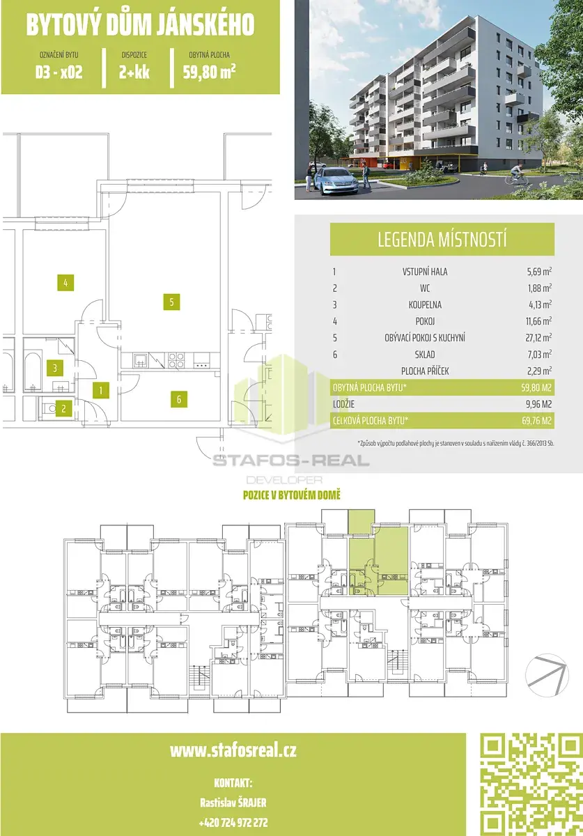 Začněte Vaší novou životní kapitolu bydlení a vychutnejte si radost z bydlení v zbrusu novém bytě. Prověřujeme evidenci exekucí, insolvencí a dluhů na zdravotním pojištění našich potenciálních nájemníků. Pro lepší představu o tomto bydlení vám doporučujeme shlédnout virtuální prohlídku, která vám také poskytne možnost změřit jakýkoliv rozměr tohoto bytu. Volné od listopadu/prosince 2025. Kompletní nabídku bytů v domě najdete na našich stránkách STAFOS-REAL.