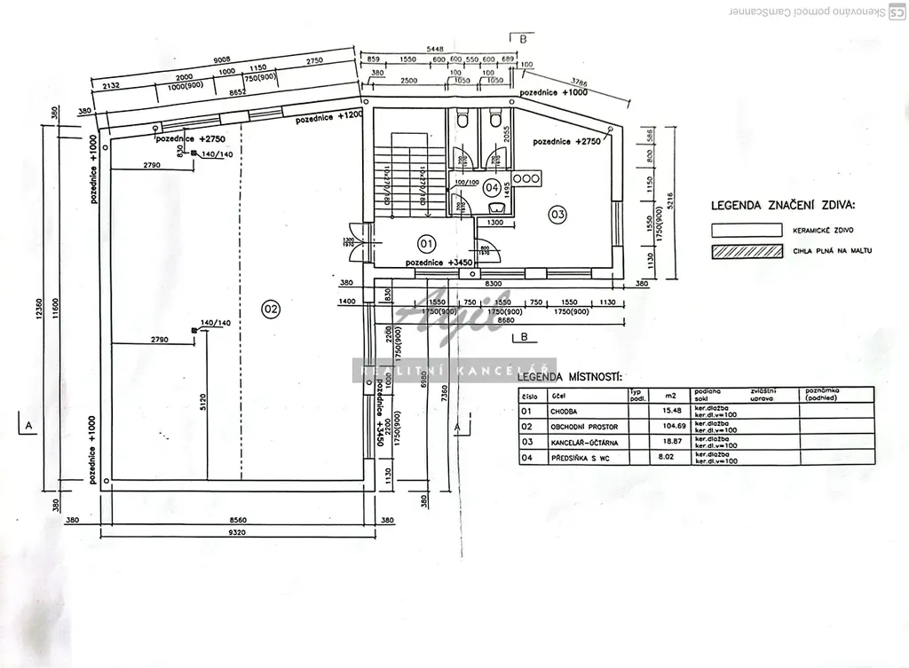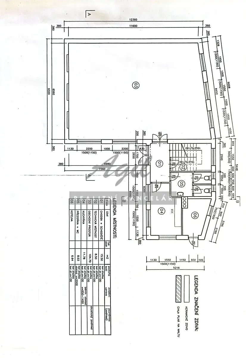 Chodba 5 m2, technická místnost 9 m2, místnost 105 m2, kuchyňka 12 m2, WC s předsíňkou 8 m2, kotelna 7 m2, průjezd a 1x parkovací místo.