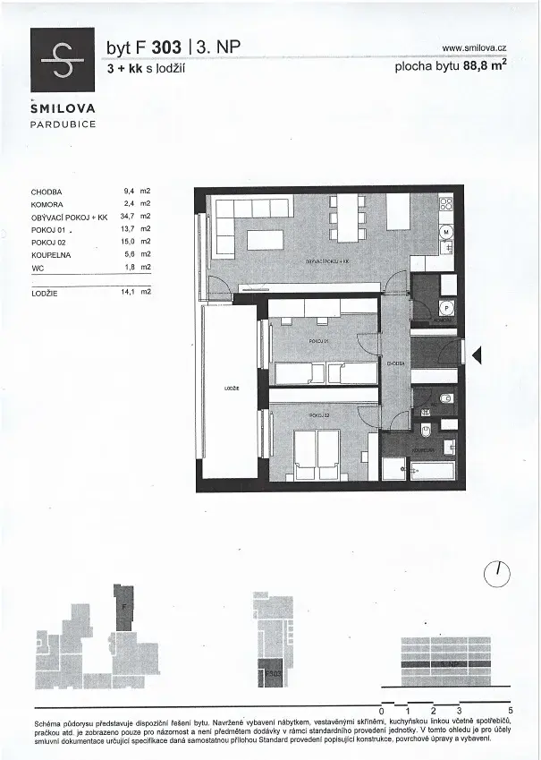 Jedná se o byt 3+KK s velkou lodžií do vnitrobloku/na západ a parkovacím stáním v parkovacím domě a sklepem (komora) na patře. Výměra bytu je 89m2 + lodžie 14.1m2 + komora na chodbě 4m2. V domě je kolárna.