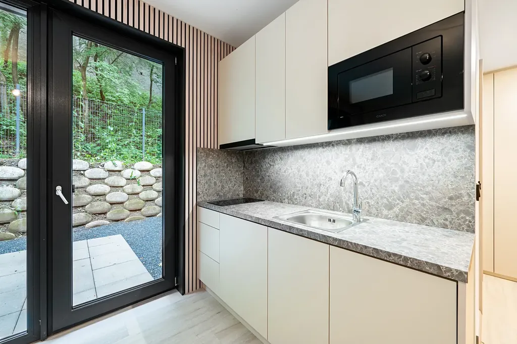 Výhodou je klidná lokalita obklopená zelení a skvělé dopravní spojení do centra. Do Anděla se dostanete za 9 minut. Pro milovníky procházek a sportu je v pěší dostupnosti Prokopské údolí.