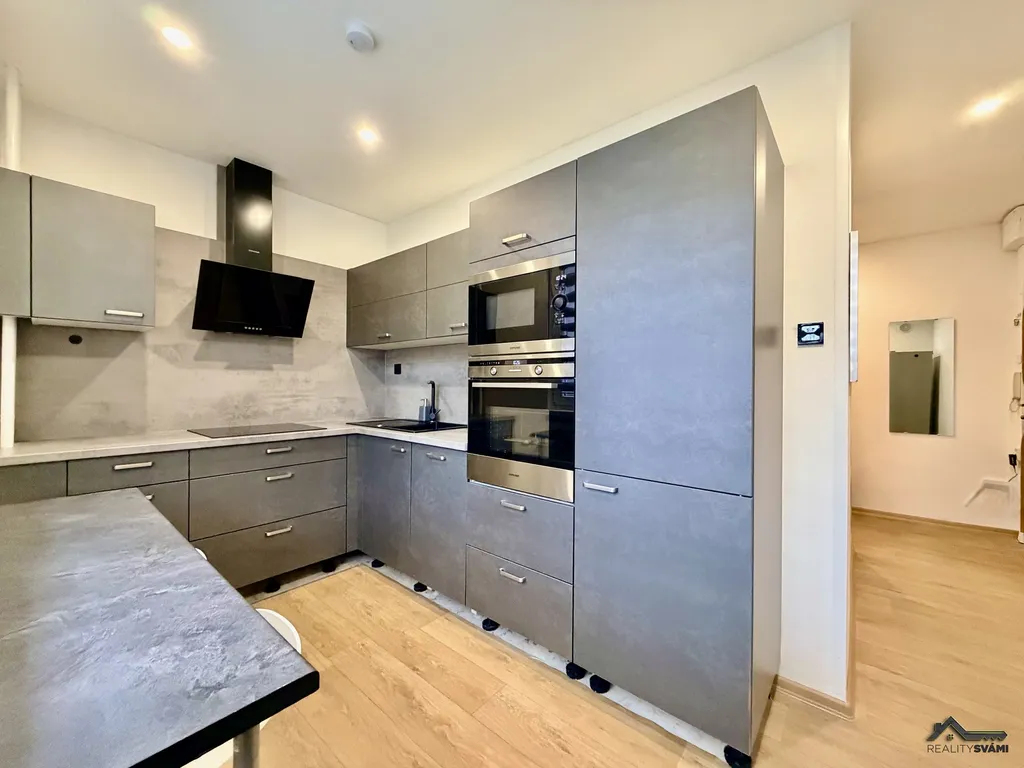 • krásná kuchyňská linka se spotřebiči (myčka, mikrovlnka, horkovzdušná trouba, indukce)