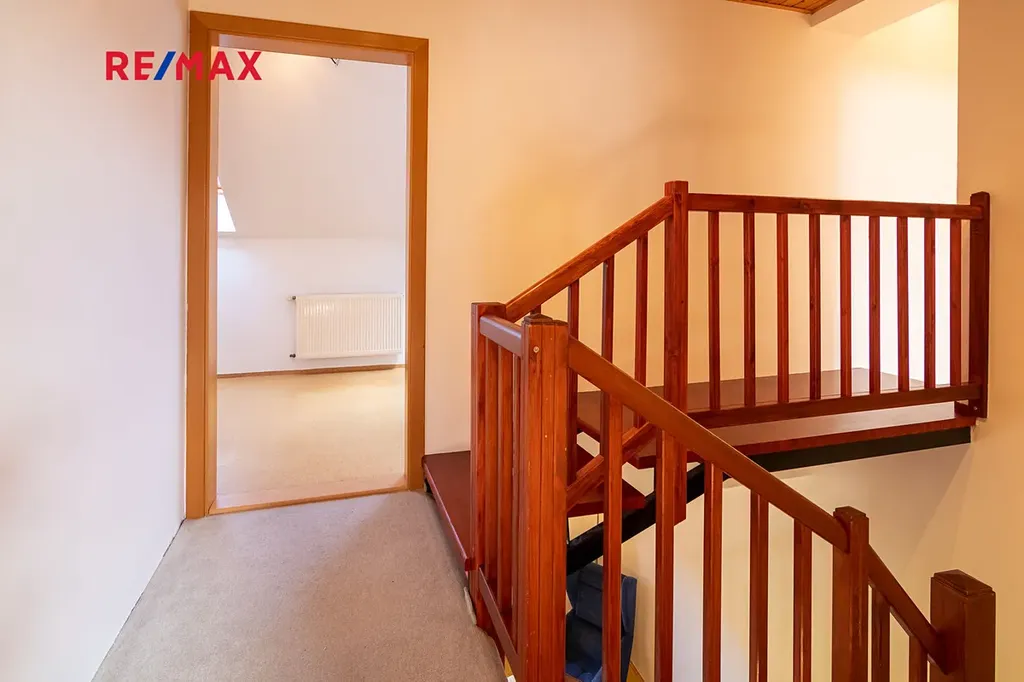Vytápění plynovým kotlem umístěným v koupelně v 1.patře. Schodiště do patra je z masivu.