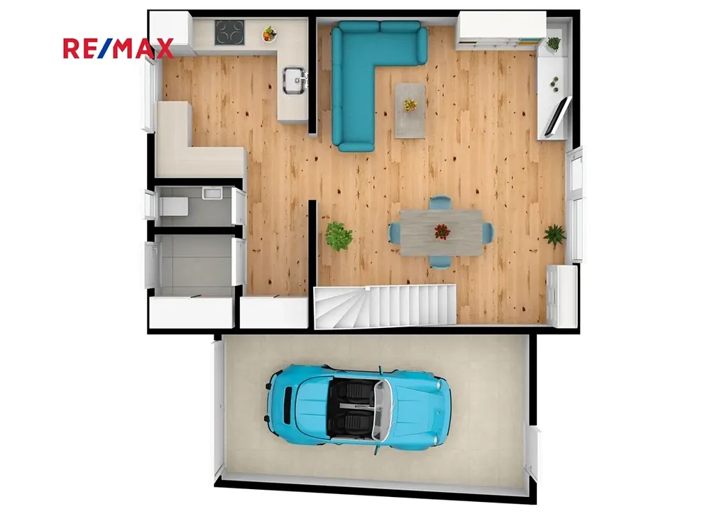 Garáž s el. ovládanými vraty a zadním vstupem na zahradu.