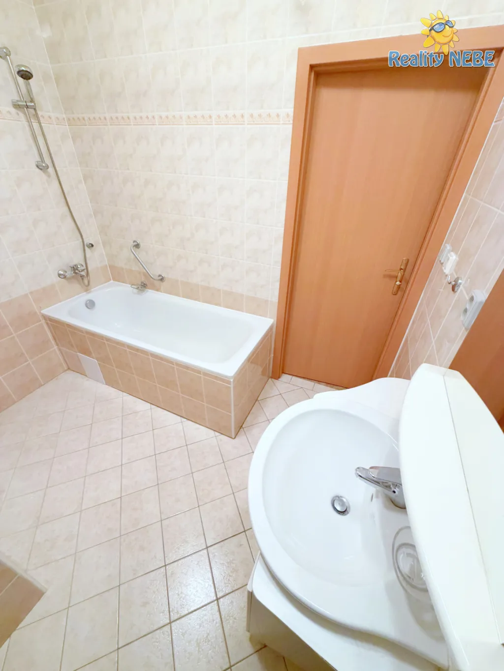 Skládá se ze samostatné ložnice, dále obývacího pokoje s kuchyňským koutem (zařízeným linkou s el. troubou, varnou deskou, myčkou nádobí). Dále je zde koupelna s vanou a přípojkou na pračku, samostatné WC s umývadlem a nakonec komora s vestavnými skříněmi. Oba pokoje jsou propojeny prostorným balkonem s JV orientací. K bytu náleží také sklep v suterénu domu o velikosti cca 3m a kryté parkovací stání.