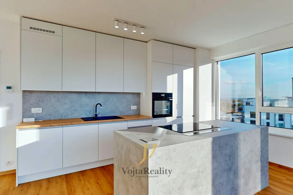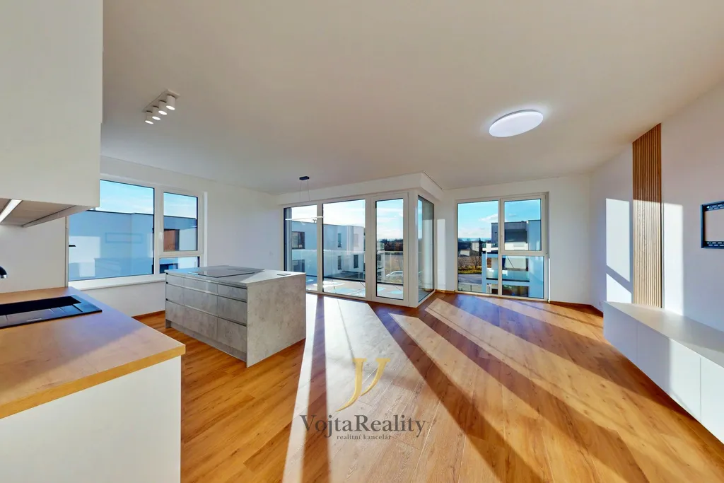 Dispozice bytu je navržena s důrazem na komfort, funkčnost a dostatek úložného prostoru. Vstupní chodba je vybavena vestavěným nábytkem s nočním osvětlením. Obývací pokoj je propojen s moderní kuchyní, která nabízí kuchyňský ostrůvek s indukční varnou deskou a výsuvnou digestoří, nadstandardně velkou lednicí s mrazákem a kompletní sadu spotřebičů.
