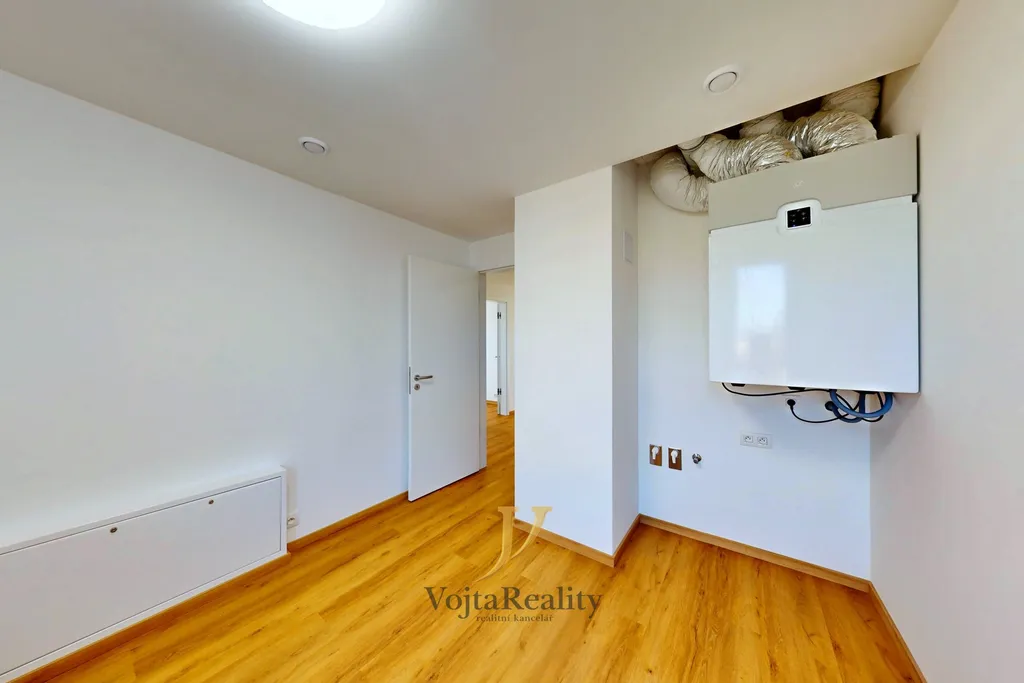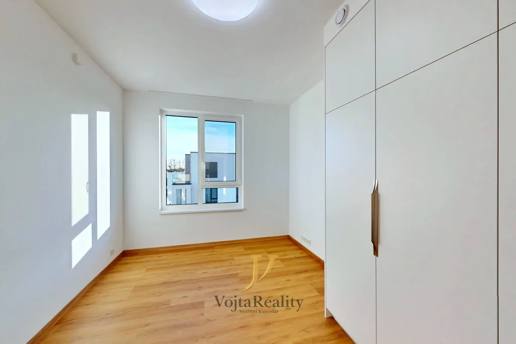 Ložnice disponuje vestavěným úložným nábytkem na míru a přímým vstupem na vlastní terasu. Další dva pokoje lze využít jako dětský pokoj a pracovnu. Koupelna je vybavena vanou, sprchovým koutem, dvojitým umyvadlem a úložnými prostory. Samostatná toaleta nabízí bidetové WC a malé umyvadlo. Praktickou součástí bytu je technická místnost s rekuperační jednotkou, která zároveň poskytuje prostor pro pračku, sušičku i další skladování.