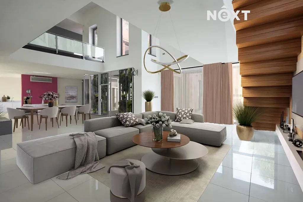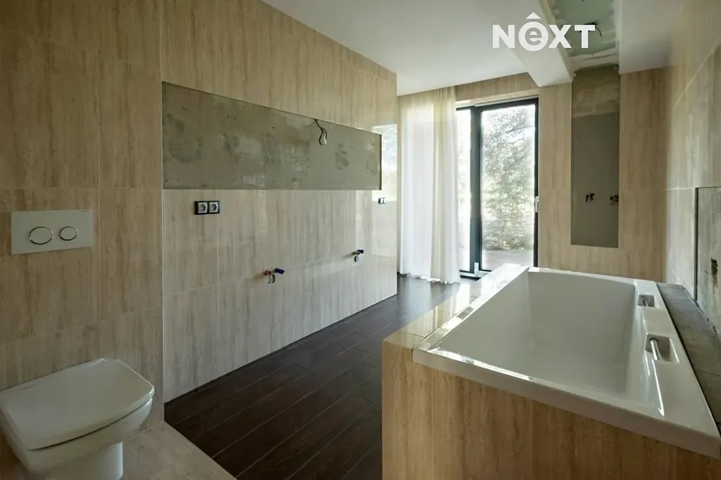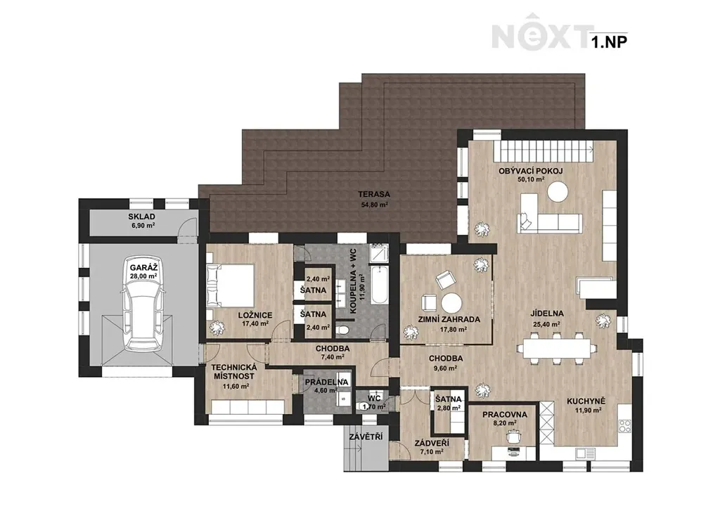 1.NP: zádveří (4,60 m2 a 7,10 m2), šatna (2,80 m2), pracovna (8,20 m2), samostatné WC (1,70 m2), chodba (9,60 m2), kuchyňský kout (11,90 m2), jídelna (25,40 m2), obývací pokoj (50,10 m2), zimní zahrada (17,80 m2), chodba (7,40 m2), technická místnost (11,60 m2) vč. wellness zázemí, prádelna (4,60 m2), ložnice (17,40 m2), dvě šatny (2,40 m2 a 2,40 m2), koupelna s WC (11,90 m2), garáž (28 m2) s přímým vstupem do domu, sklad (6,30 m2), terasa (54,80 m2) s výhledem do zahrady nabízí dostatek soukromí a místo pro příjemné posezení a relaxaci.