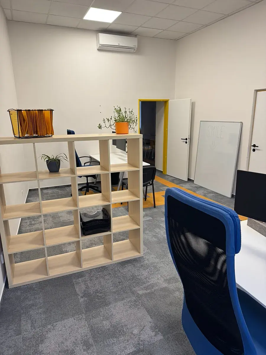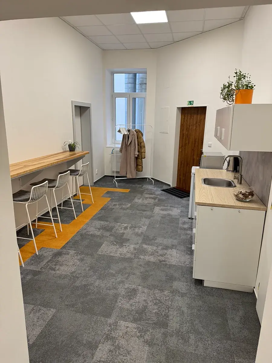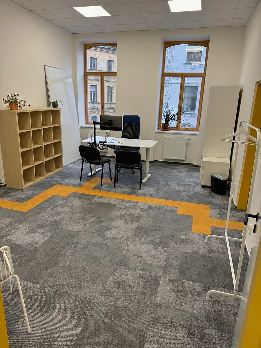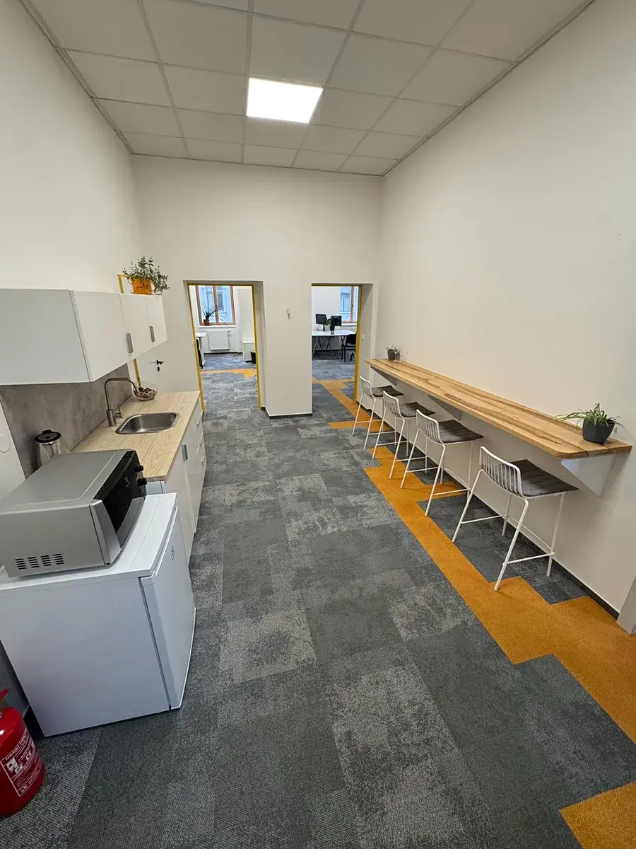 V prostorech je movitý majetek nájemce, tedy vybavení interiéru, což jsou kancelářské stoly, židle, barové židle, lednice, mikrovlnná trouba atd. Toto je stávající nájemce v zájmu rychlejšího pronájmu ochoten předat novému nájemci zdarma.